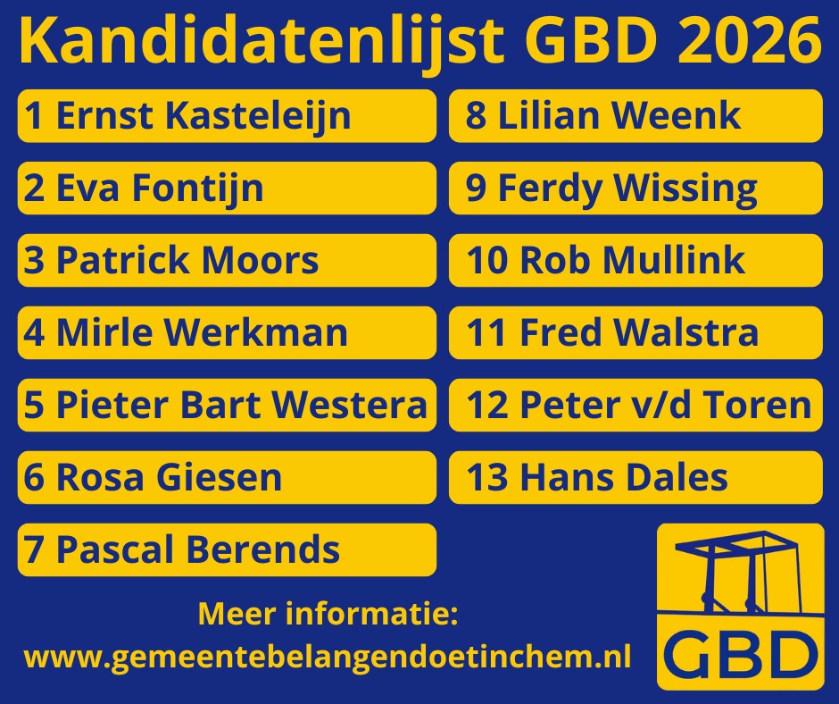 Met de vaststelling van de lijst zet GBD een belangrijke stap richting de verkiezingen. De kandidatenlijst bestaat uit een sterke en evenwichtige groep mensen uit de hele gemeente. Jong en oud, vrouwen en mannen, ervaren krachten en nieuw talent zijn goed vertegenwoordigd. Ook is er aandacht voor zowel de stad als de dorpen.